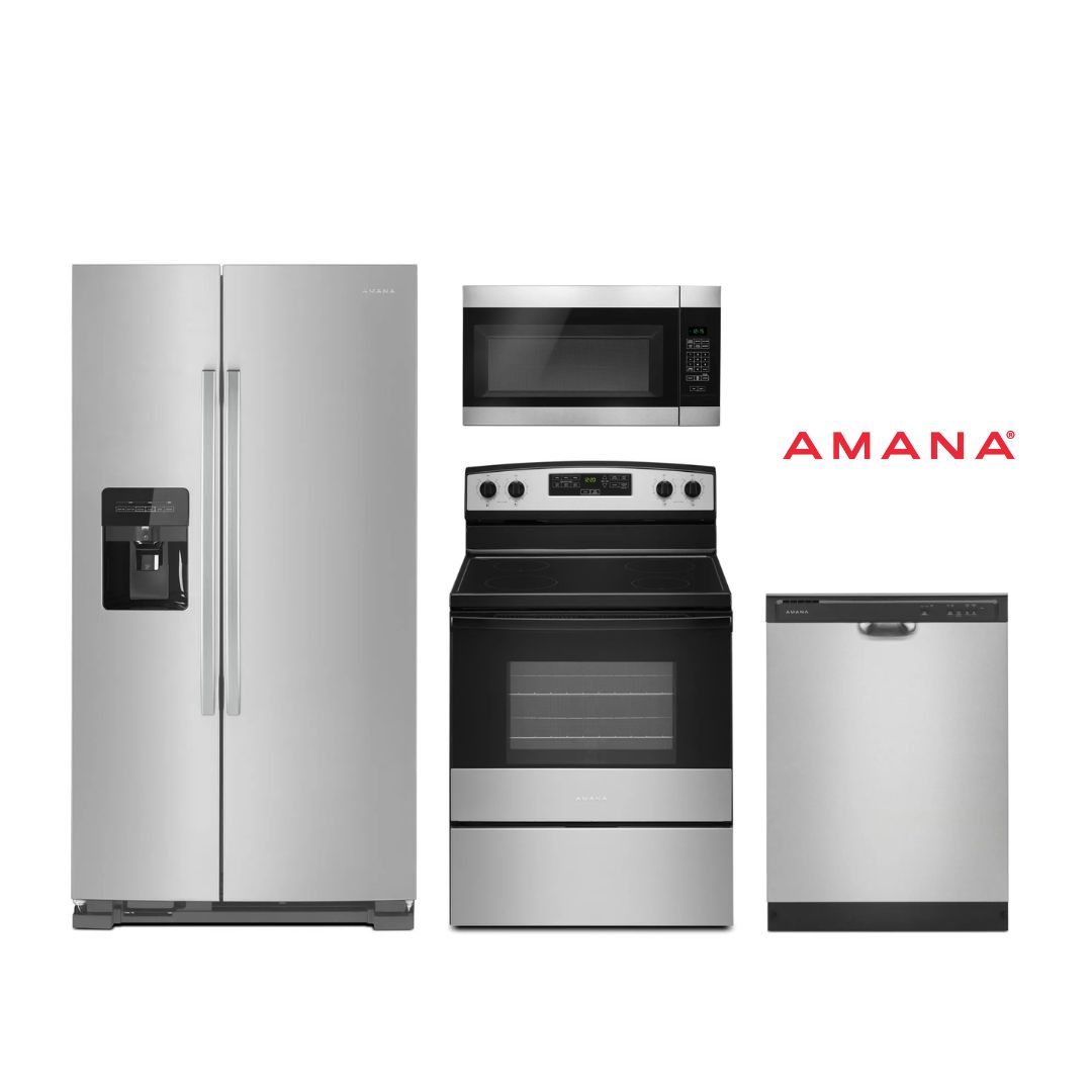 Amana® 24.6 Cu. Ft. Stainless Steel Side-By-Side Refrigerator, 30" Stainless Steel Freestanding Electric Range, 1.6 Cu. Ft. Black on Stainless Over The Range, 24" Stainless Steel Front Control Built In DishwasherRead More