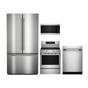 KitchenAid® 4 Piece Stainless Steel Kitchen Package with a French door refrigerator, free standing gas range, over the range microwave and built in dishwasher.Read More