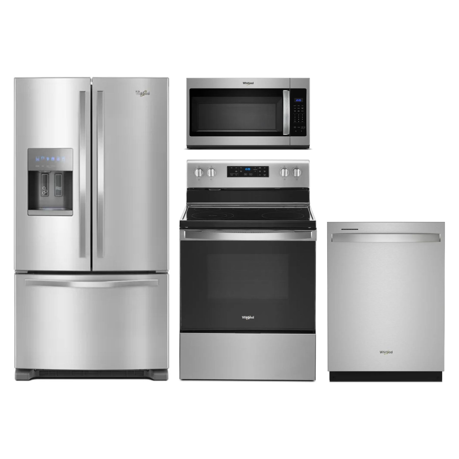 Whirlpool® 4 Piece Fingerprint Resistant Stainless Steel Kitchen Package with french door refrigerator, free standing electric range, over the range microwave, and built in dishwasherRead More