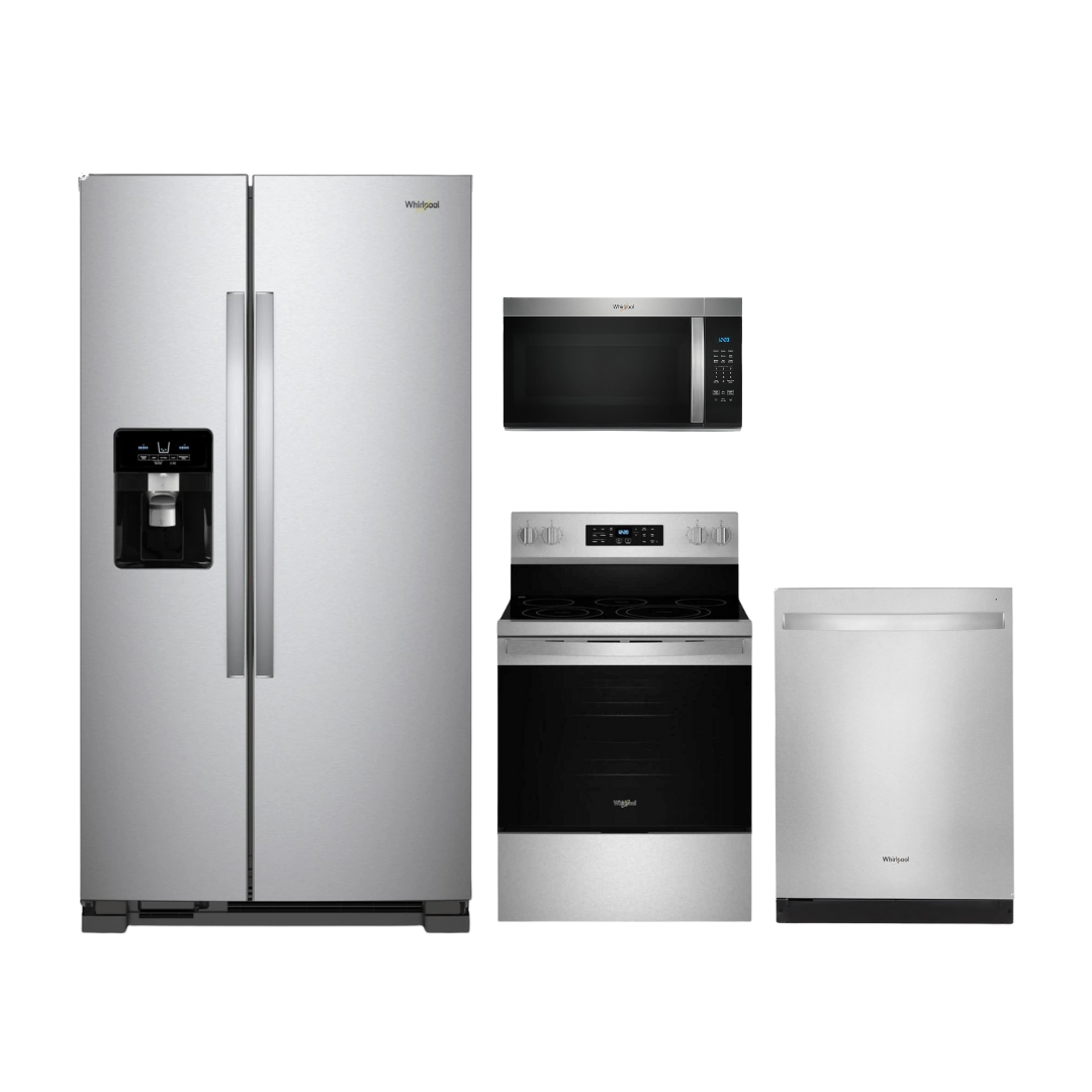 Whirlpool® 4 Piece Stainless Steel Kitchen Package with side-by-side refrigerator, freestanding electric range, built in dishwasher and over the range microwave.Read More